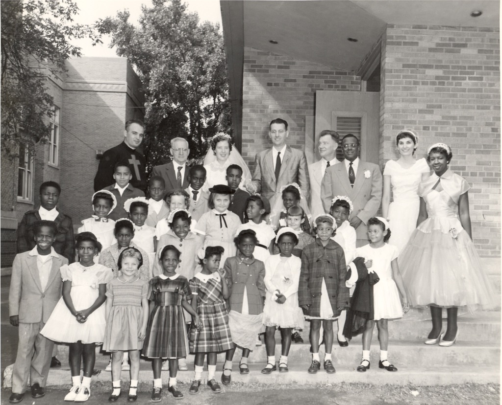 Erica P. John and Harry G. John on their wedding day in 1956 with children from the Fr. Stephen Youth Camp.