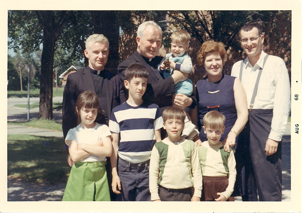 Erica P. John, Harry G. John, and children with Fr. Patrick Peyton,, C.S.C. (the rosary priest)