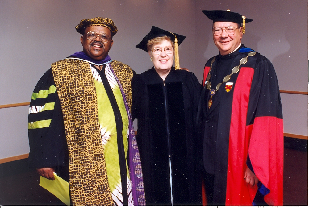 Erica P. John receiving an honorary J.D. from Marquette University, alongside Fr. Matthew Gottschalk, O.F.M., Cap., Fr. Albert DiUlio, S.J. (president of Marquette).